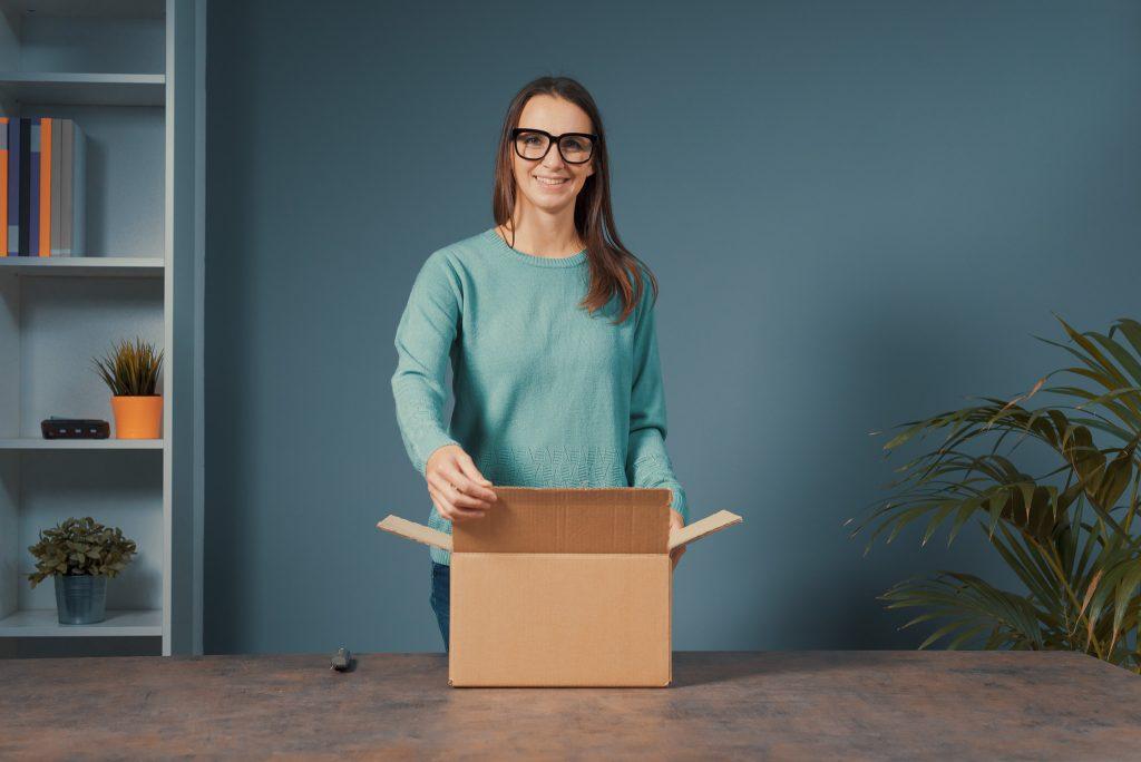 Professional influencer shooting an unboxing video, she is opening the box and talking to her followers