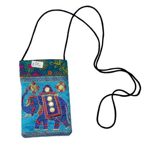 Delicate little bag/purse with a thin shoulder strap. Intricately embroidered on one side with an elephant design in gold and bright colours. This has a velcro fastening at the top to keep your contents secure, and a handy zipped pocket.