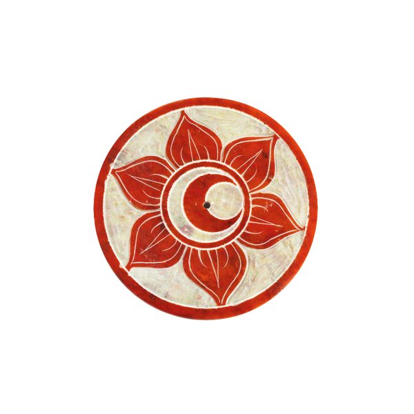 A circle chakra stone incense burner with stone in the center where incense sticks can be placed and burned, the burner can also be used for cones. The stone material is chosen for its durability and heat resistance, and the circular shape can provide a stable base for burning incense creating a pleasant aroma.