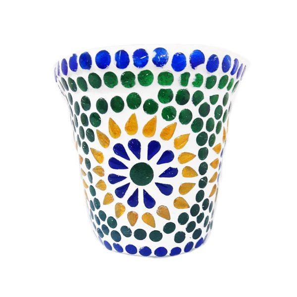 These candle holders are perfect for bringing some soft, relaxing light into your home; be it your bedroom, living room, bathroom, kitchen, or even for outdoors on warm summer nights! Beautifully decorated in a mosaic style these become great ornaments when not in use. Size: 4 inches