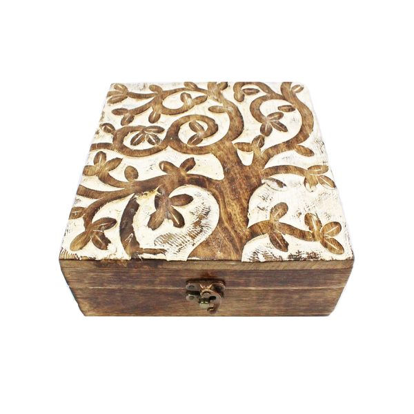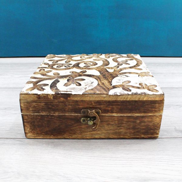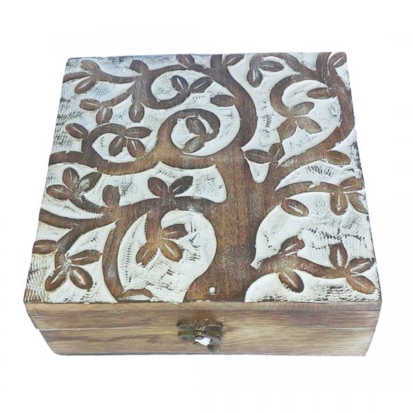 This beautiful handmade wooden jewellery box is delicately carved from wood. Perfect to keep small precious items safe and in one place. A lovely addition to your bedside table or bedroom. This beautifully carved wooden box comprises of four sides and a lid that feature intricate carvings with amazing detail.