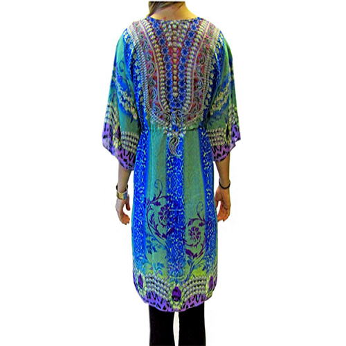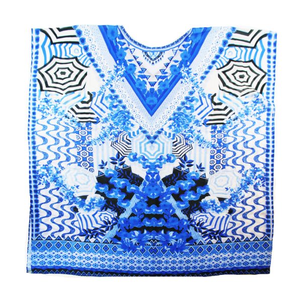 This kaftan has a pretty V-neckline and a bright, eye-catching printed design. Produced in a light fabric, this dress is a great piece for the hot summer days where you need something cool, loose and floaty. This midi slip dress/top comes in one size – this fits many different body shapes due to is simple, relaxed shape.