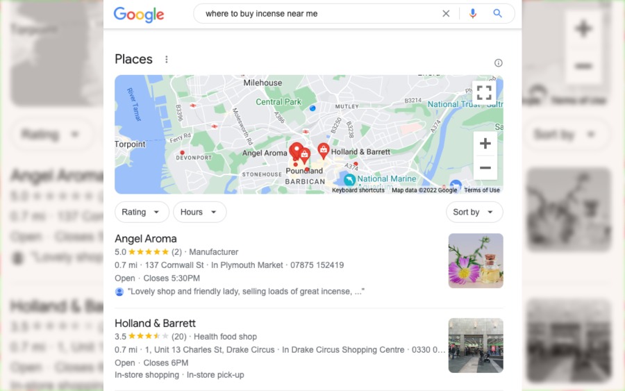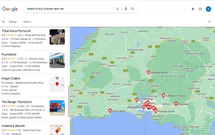 If you’re looking for a local incense supplier the best way to find one is with a Google search followed by a review of the local business listings. Check their star ratings and look for businesses with 4 and 5 star reviews, who have also had more than 10 Google reviews in total. From there you should pick 2 – 3 different websites and check that their incense is made using quality, natural ingredients. Below is the process to find the right local shop for you.